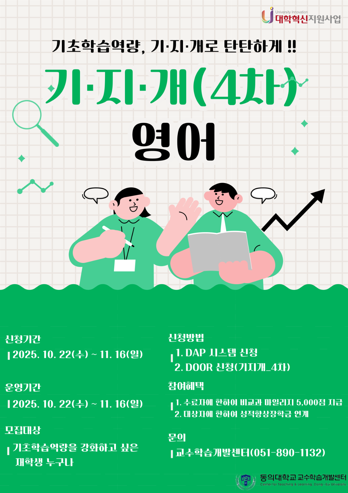 교수학습개발센터에서는 학습지원 프로그램인 2025학년도 기·지·개(기초학문 지식 개선) 4차를 다음과 같이 안내하오니 많은 신청 바랍니다.